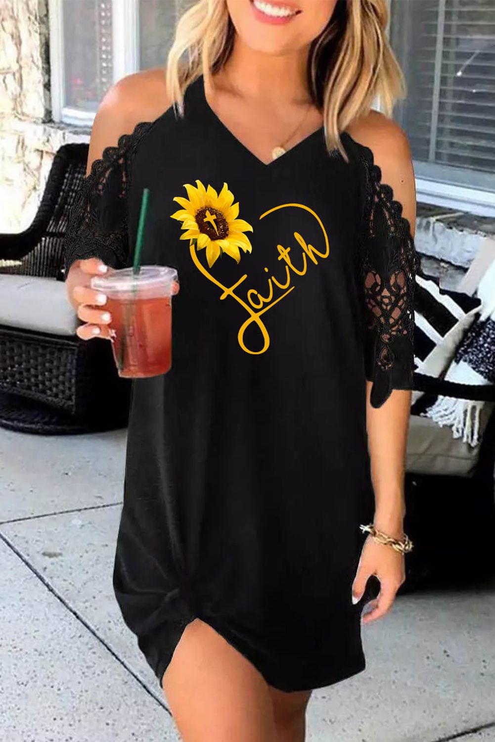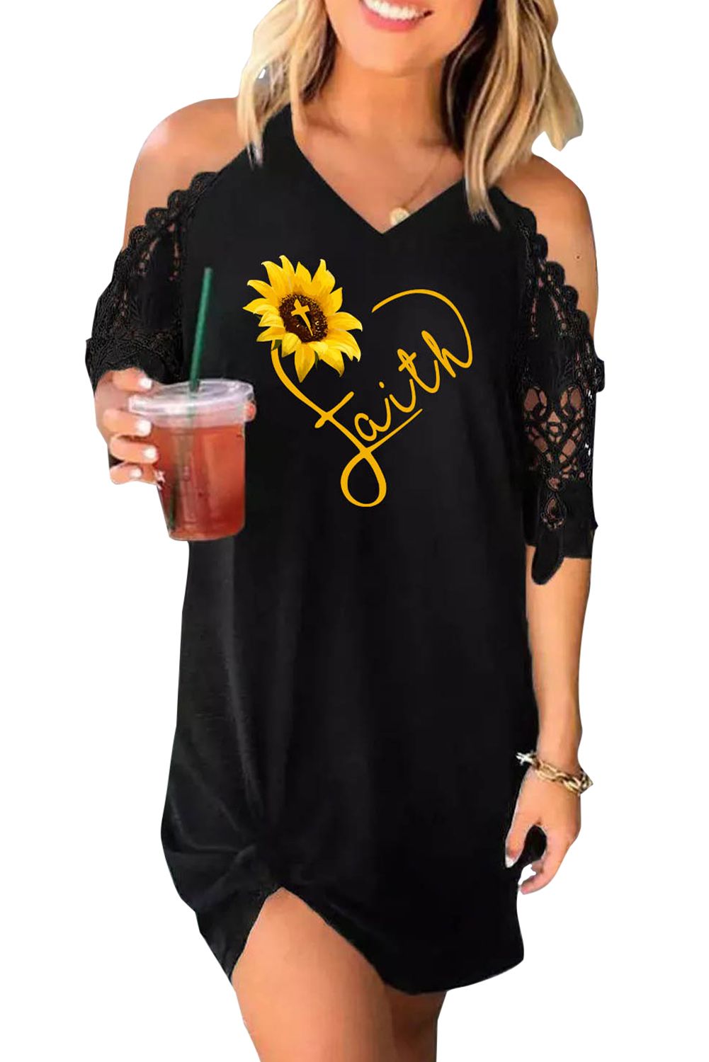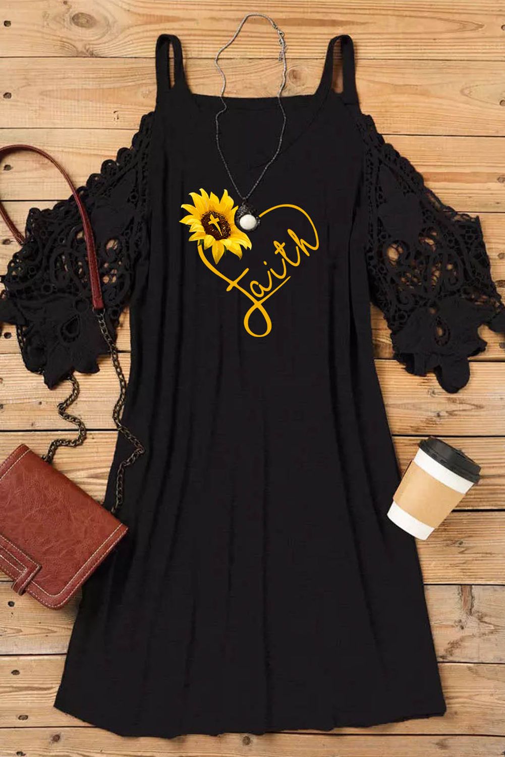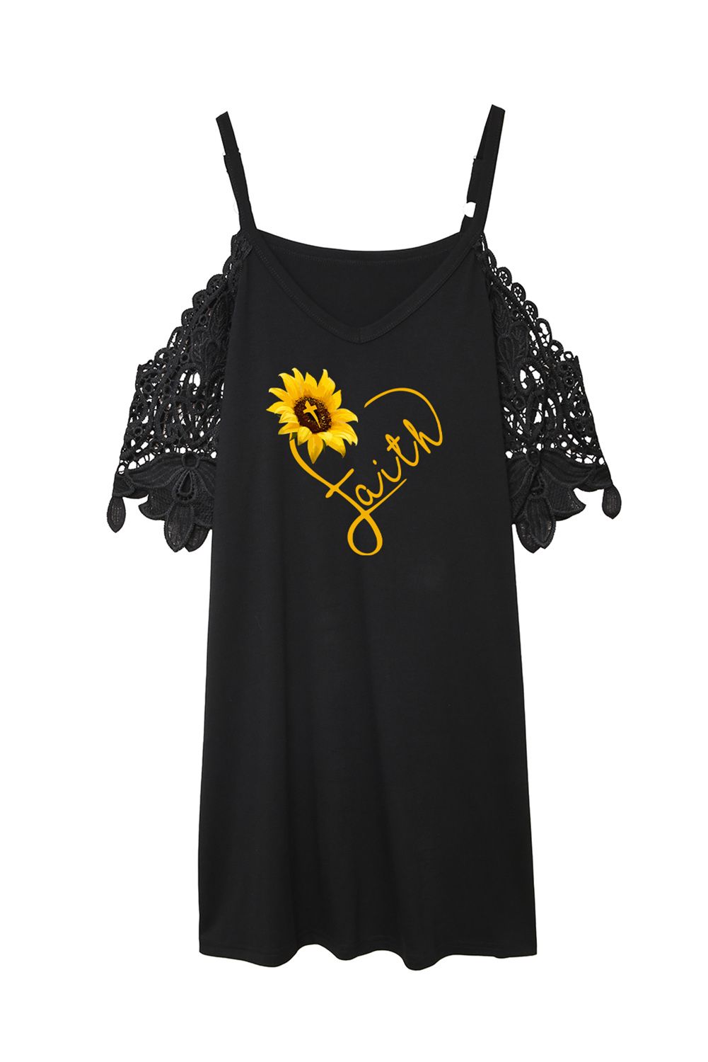 Black Faith Heart Sunflower Print Lace Sleeve Cold Shoulder Mini Dress