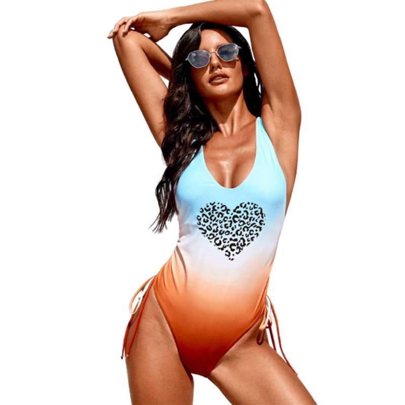 Leopard Heart Gradient Color Print Drawstring Backless Swimwear