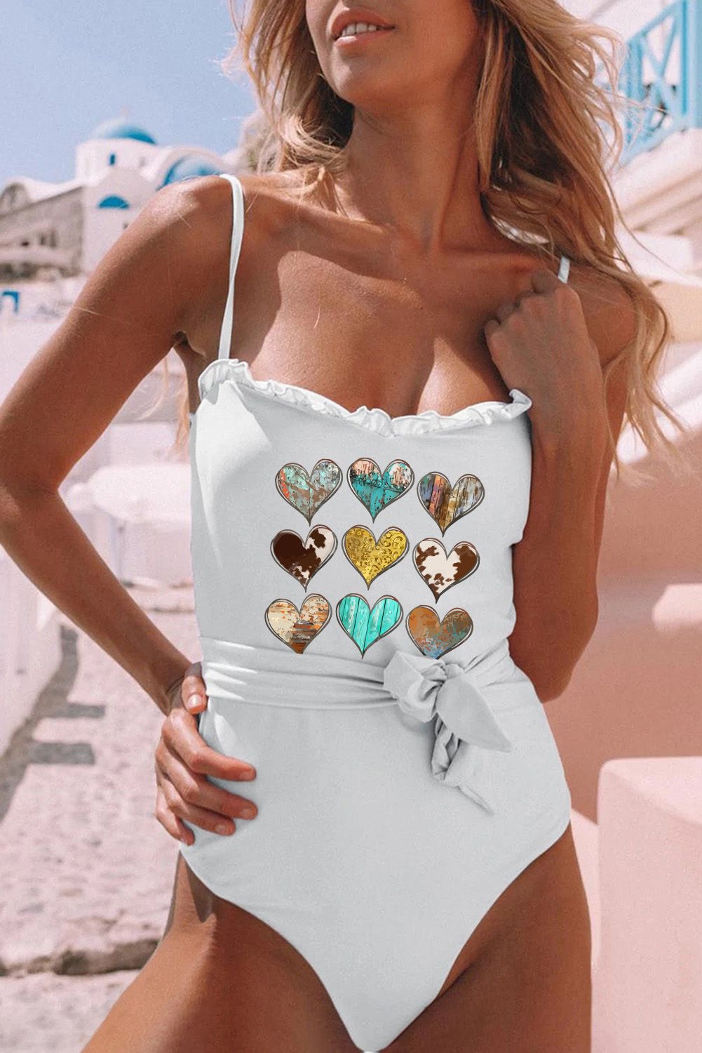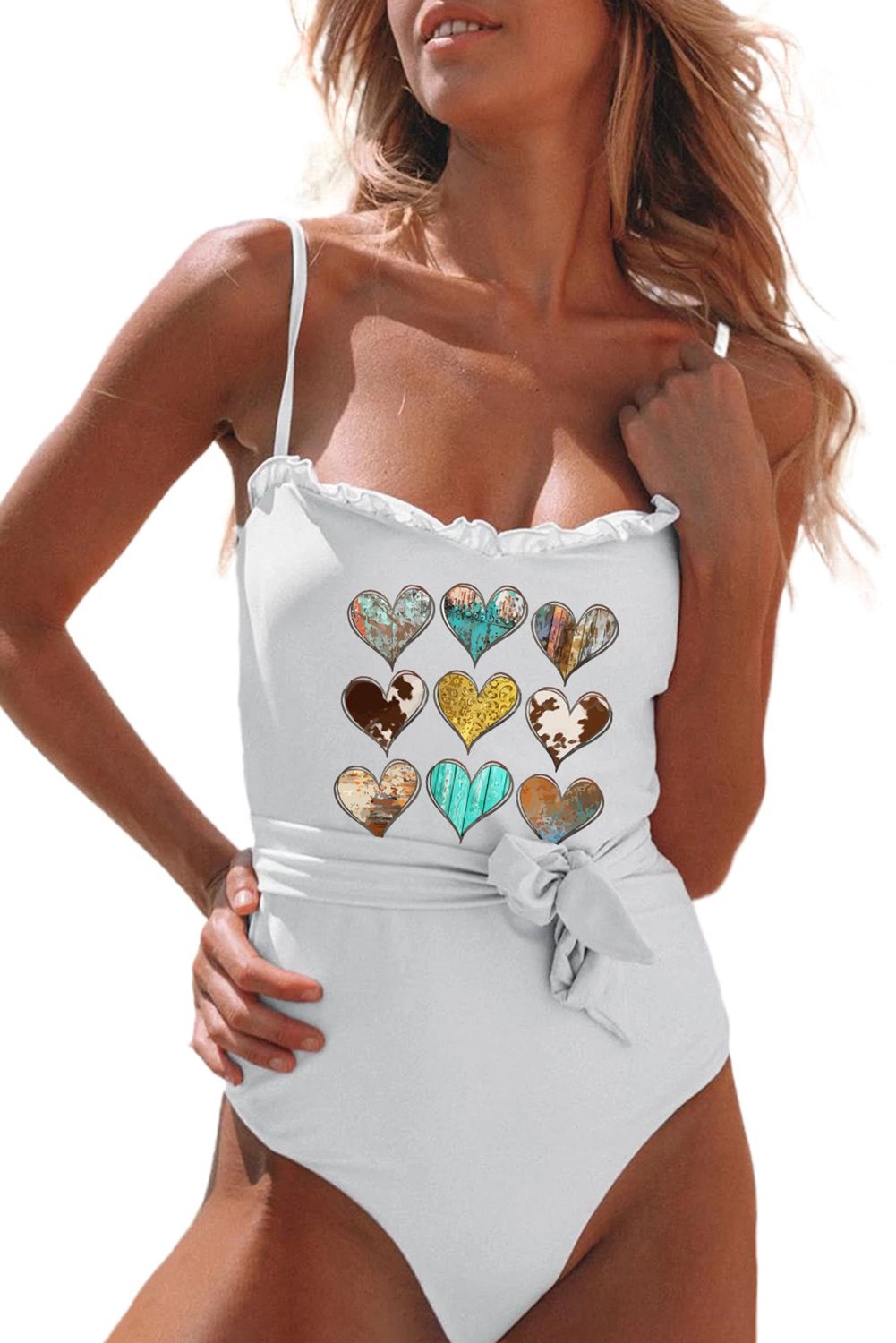Western Heart-shape Print Frilled Lace-up One-piece Swimwear