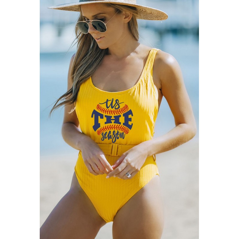 Baseball Letter Print Ribbed Backless One-piece Swimwear